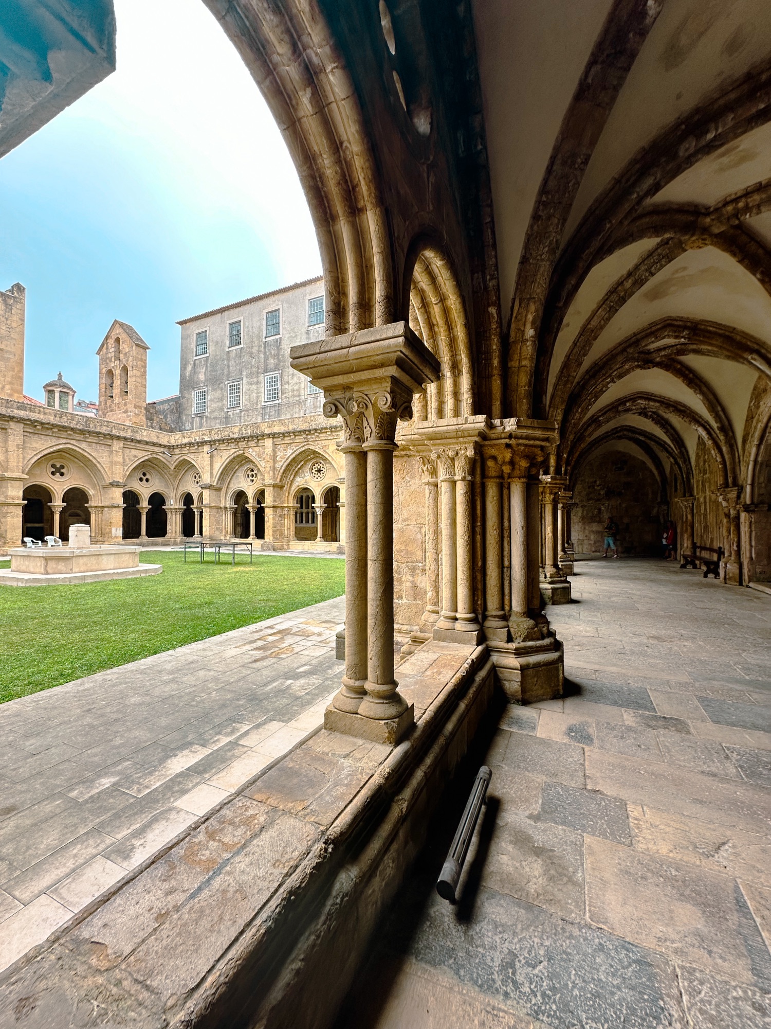 Una delle tappe di questo viaggio frenetico e climaticamente instabile, è stata Coimbra. Il suo chiostro universitario ha un balcone che dà sulla cittadina, che si si sviluppa arroccata sul lato di un colle pendente su un corso d’acqua. Non sono stata in grado di distinguere il panorama sotto di me, avvolto in una nube spettrale di umidità bruciante, fredda, penetrante. Le università storiche esercitano su di me una particolare attrazione: l’idea di sedersi nella sua polverosa e buia biblioteca e sfogliare un libro scritto a mano mi catapulta in un’altra epoca. Chi non ha mai pensato come sarebbe stato nascere in un altro tempo – se poi si è di indole leggermente apprensiva come la mia, di certo si contempla il passato come una realtà più rassicurante (o dagli esiti prevedibili). Fra gli scaffali, che si possono guardare solo da lontano, ho cercato di scorgere i veri padroni di quelle stanze, i pipistrelli. Servono a preservare l’equilibrio microbiologico della stanza, favorendo la conservazione dei libri. Lo so, è stato strano anche per me.